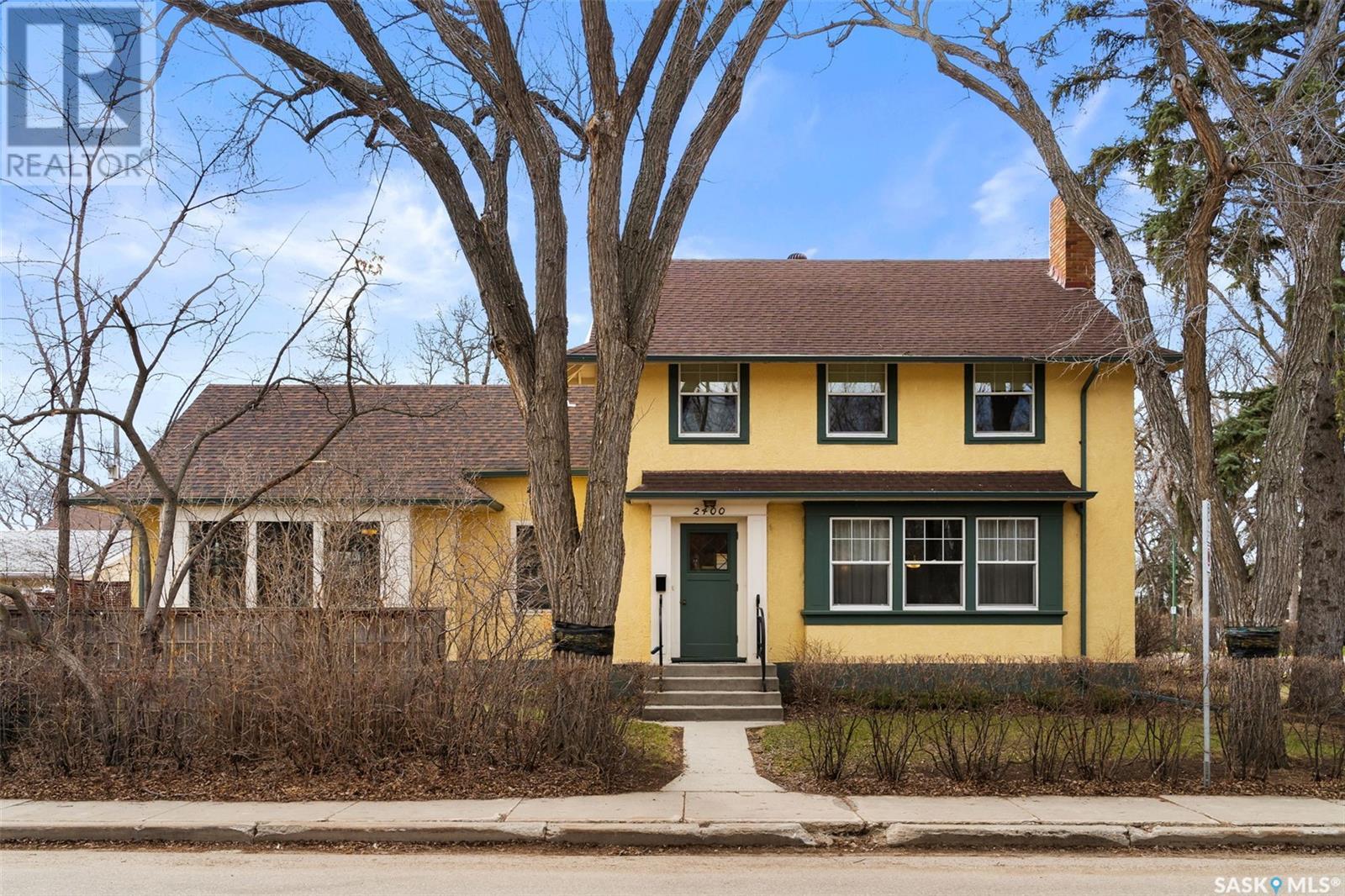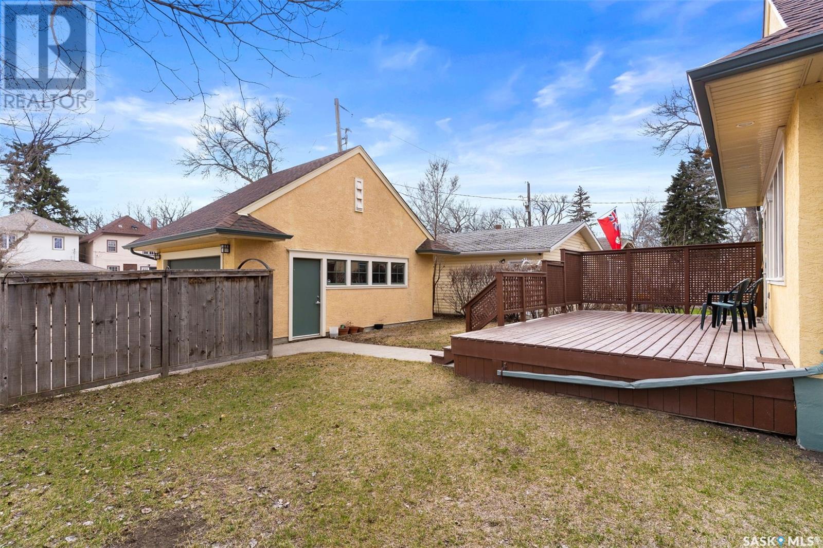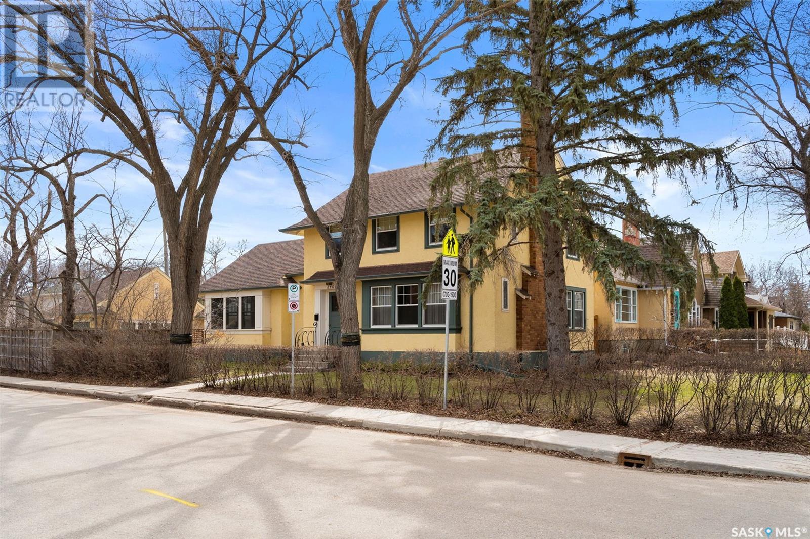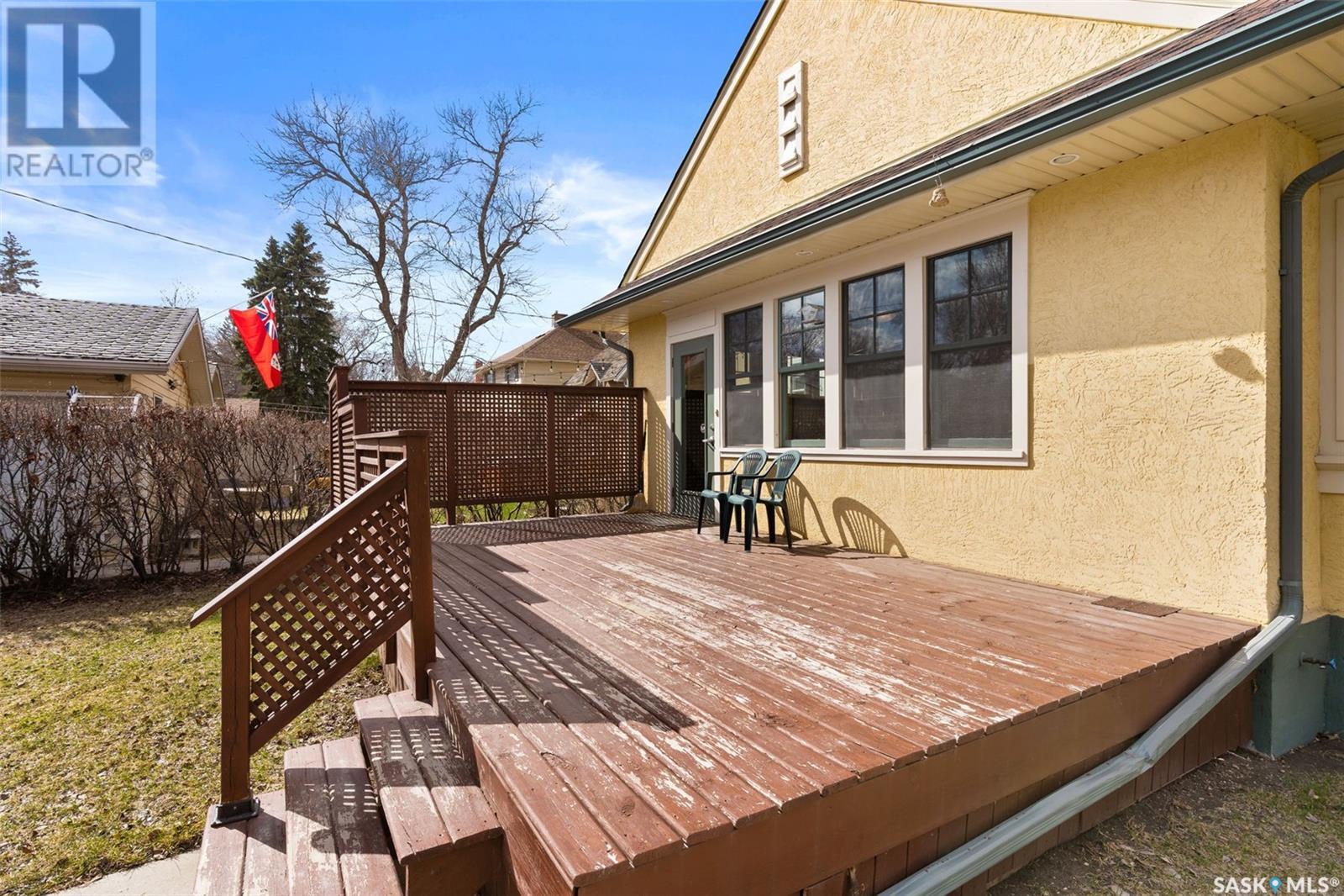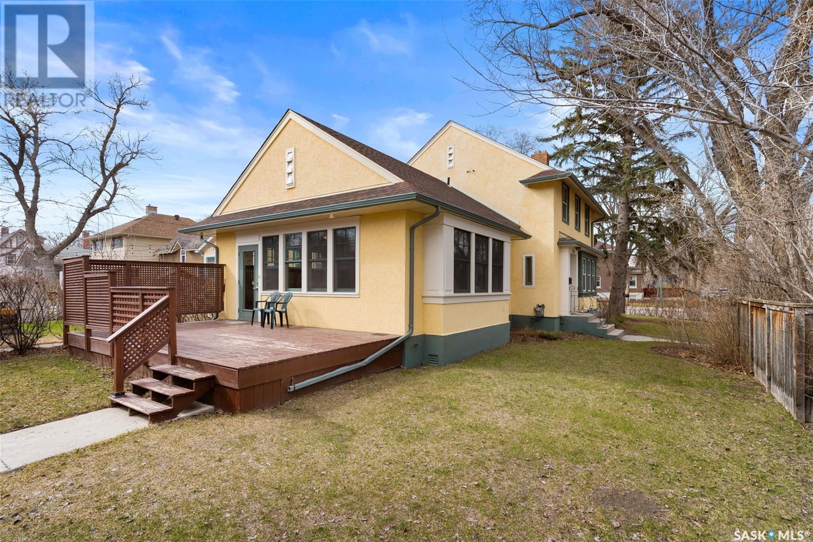 Nestled in the prestigious Crescents neighborhood, this Francis Henry Portnall-designed character home blends timeless elegance with modern convenience. Lovingly maintained and thoughtfully updated, it offers exceptional charm and functionality. A 2007 main floor addition, built on piles, enhances the space with a bright family room featuring vaulted ceilings, windows on three sides, and garden doors to a south-facing deck and backyard—ideal for relaxation and entertaining. The foyer welcomes you with original coat hooks and a large closet. French door leads to the front living room, where an original brick fireplace is flanked by built-in bookshelves with glass doors. Hardwood floors flow through the living and dining rooms, maintaining the home’s rich character. The formal dining room, perfect for entertaining, connects to a kitchen with original ceiling-height cabinetry, updated countertops, a butcher block section, a pantry, and a cozy eating nook. Newer vinyl plank flooring and modern appliances enhance style and function. A main floor three-piece bathroom adds convenience, while a laundry room off the kitchen offers extra counter space and maple cabinetry. Original staircase leads to three hardwood-floored bedrooms and an updated four-piece bathroom with a refinished tub, terrazzo flooring, and modernized plumbing. A large linen closet provides additional storage. Basement includes a rec room, utility room, and storage with an included safe. A new boiler system (2011) and updated windows improve energy efficiency. The exterior was re-stuccoed (2019), and updated eavestroughs ensure durability. The oversized single detached garage, built in 2007, provides ample parking and storage, featuring upgraded electrical and shelving. Ideally located, this home is a short walk to downtown, Wascana Park, The Crescents Elementary School, and Cathedral shops. Own a piece of Regina’s history in one of its most sought-after neighborhoods. Don’t miss this rare opportunity! (id:17834)
