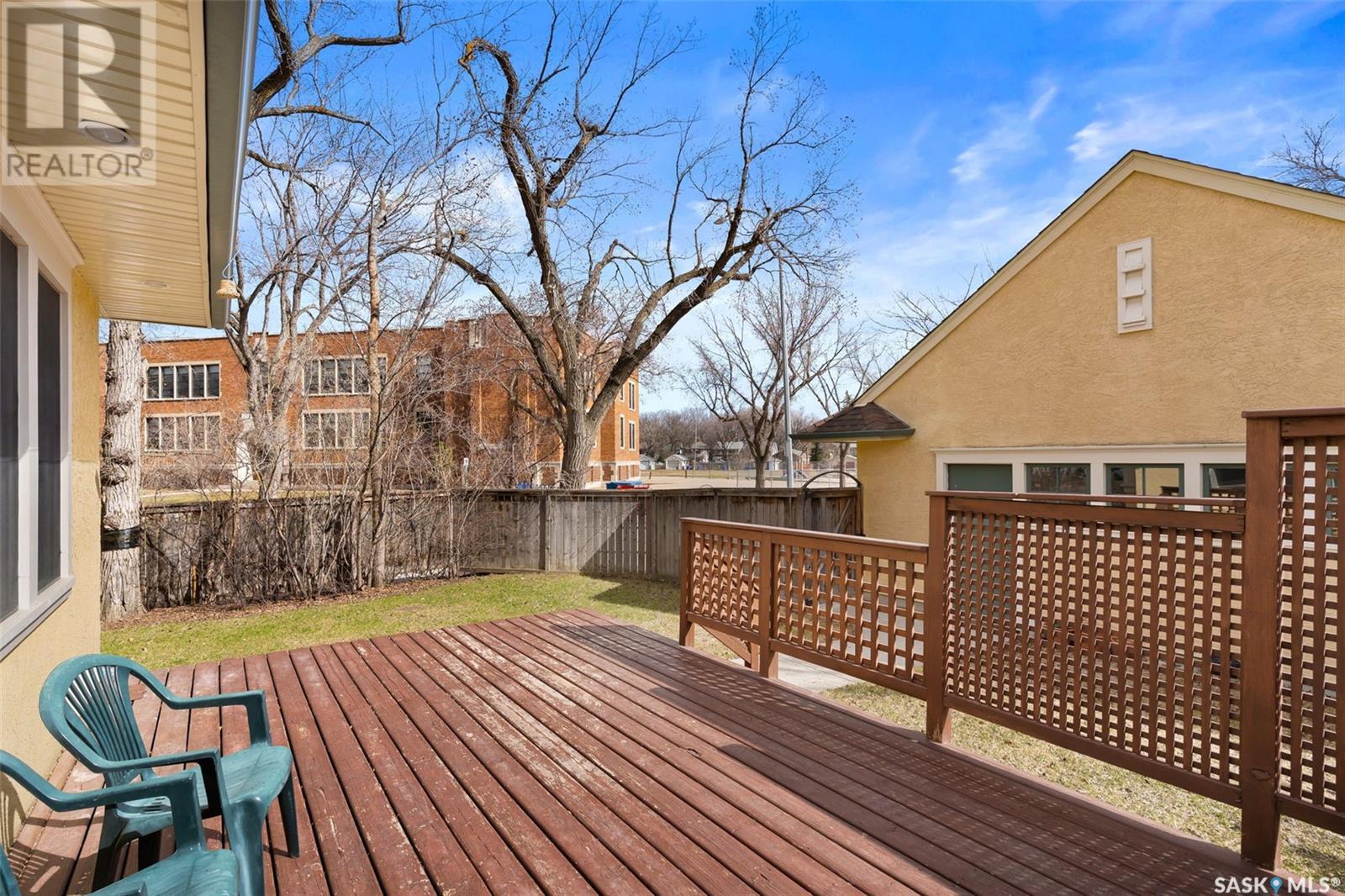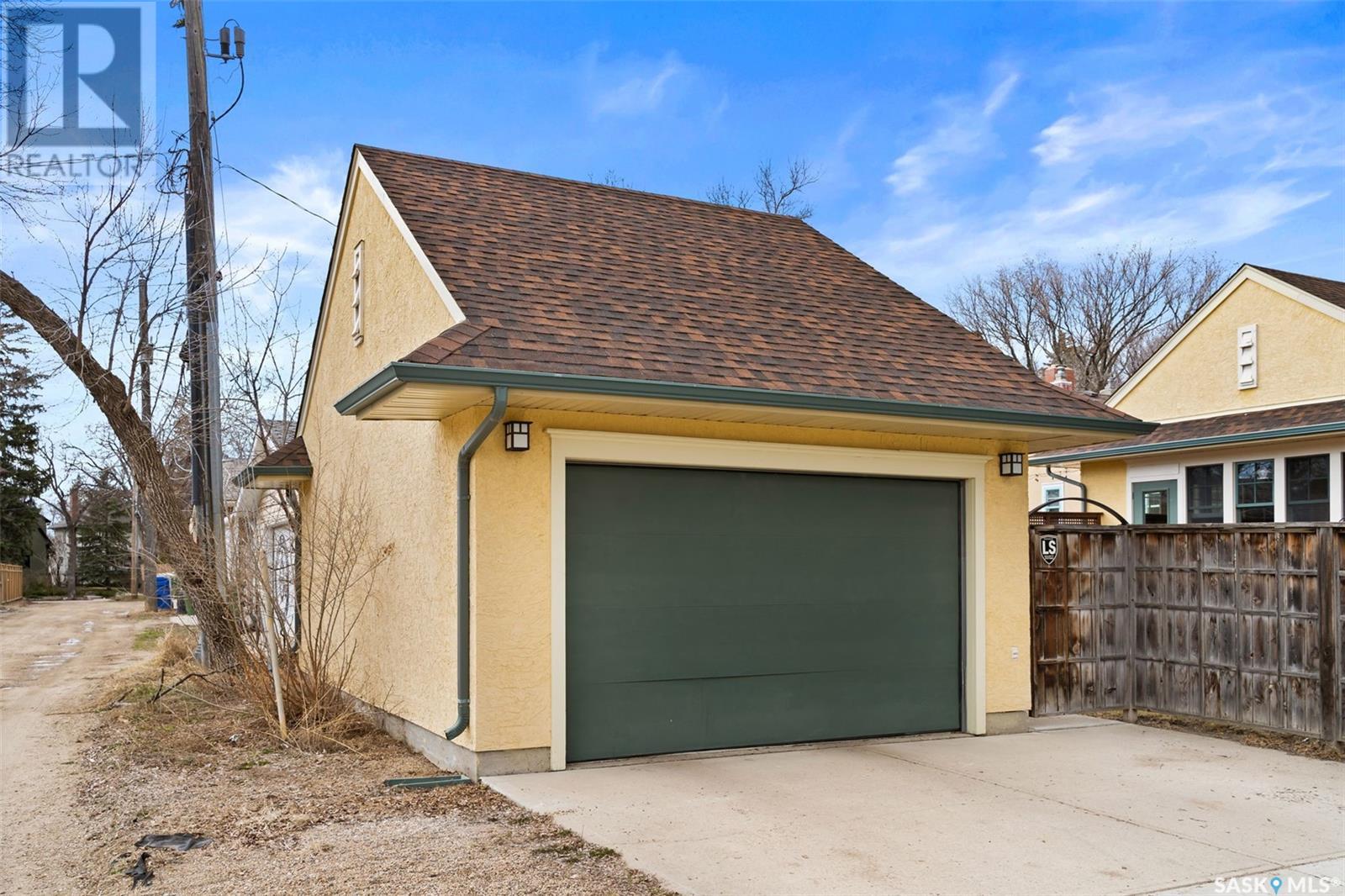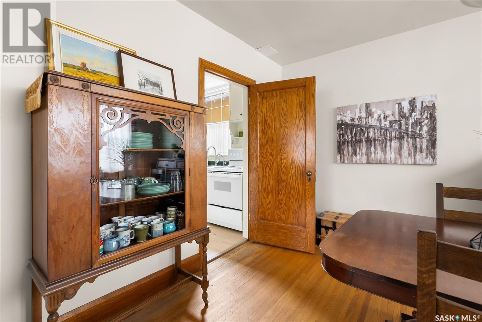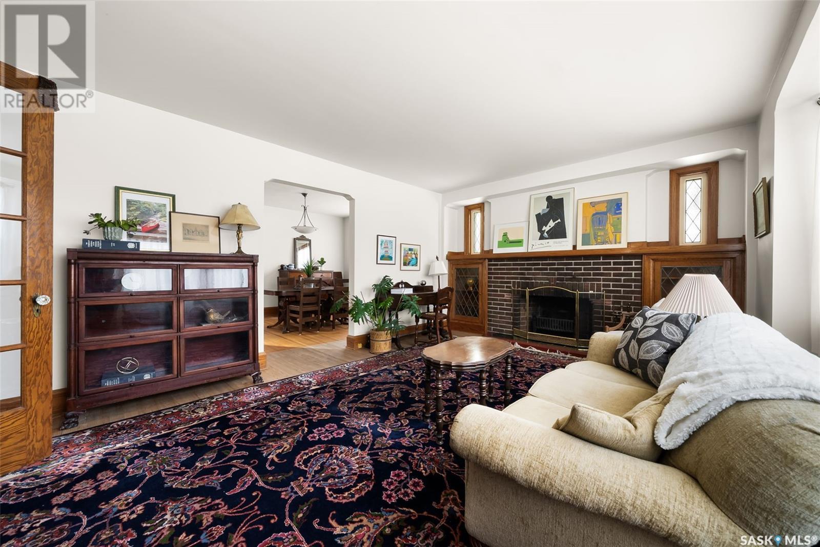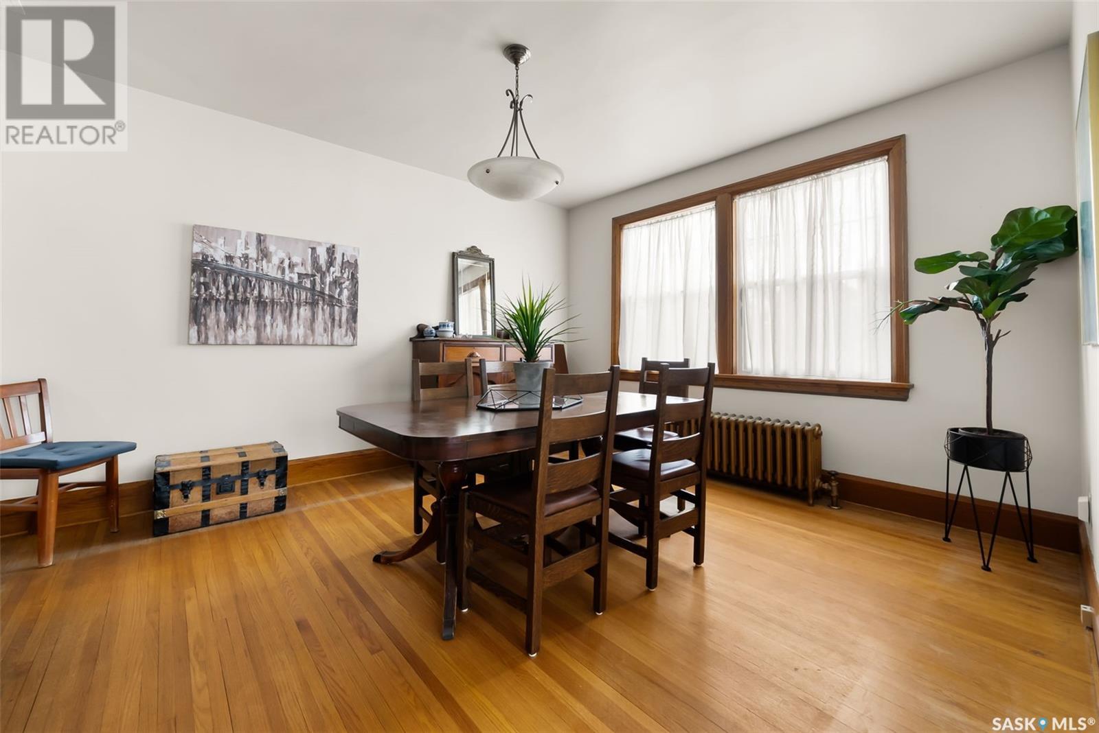 Nestled in the prestigious Crescents neighborhood, this Francis Henry Portnall-designed character home blends timeless elegance with modern convenience. Lovingly maintained and thoughtfully updated, it offers exceptional charm and functionality. A 2007 main floor addition, built on piles, enhances the space with a bright family room featuring vaulted ceilings, windows on three sides, and garden doors to a south-facing deck and backyard—ideal for relaxation and entertaining. The foyer welcomes you with original coat hooks and a large closet. French door leads to the front living room, where an original brick fireplace is flanked by built-in bookshelves with glass doors. Hardwood floors flow through the living and dining rooms, maintaining the home’s rich character. The formal dining room, perfect for entertaining, connects to a kitchen with original ceiling-height cabinetry, updated countertops, a butcher block section, a pantry, and a cozy eating nook. Newer vinyl plank flooring and modern appliances enhance style and function. A main floor three-piece bathroom adds convenience, while a laundry room off the kitchen offers extra counter space and maple cabinetry. Original staircase leads to three hardwood-floored bedrooms and an updated four-piece bathroom with a refinished tub, terrazzo flooring, and modernized plumbing. A large linen closet provides additional storage. Basement includes a rec room, utility room, and storage with an included safe. A new boiler system (2011) and updated windows improve energy efficiency. The exterior was re-stuccoed (2019), and updated eavestroughs ensure durability. The oversized single detached garage, built in 2007, provides ample parking and storage, featuring upgraded electrical and shelving. Ideally located, this home is a short walk to downtown, Wascana Park, The Crescents Elementary School, and Cathedral shops. Own a piece of Regina’s history in one of its most sought-after neighborhoods. Don’t miss this rare opportunity! (id:17834)