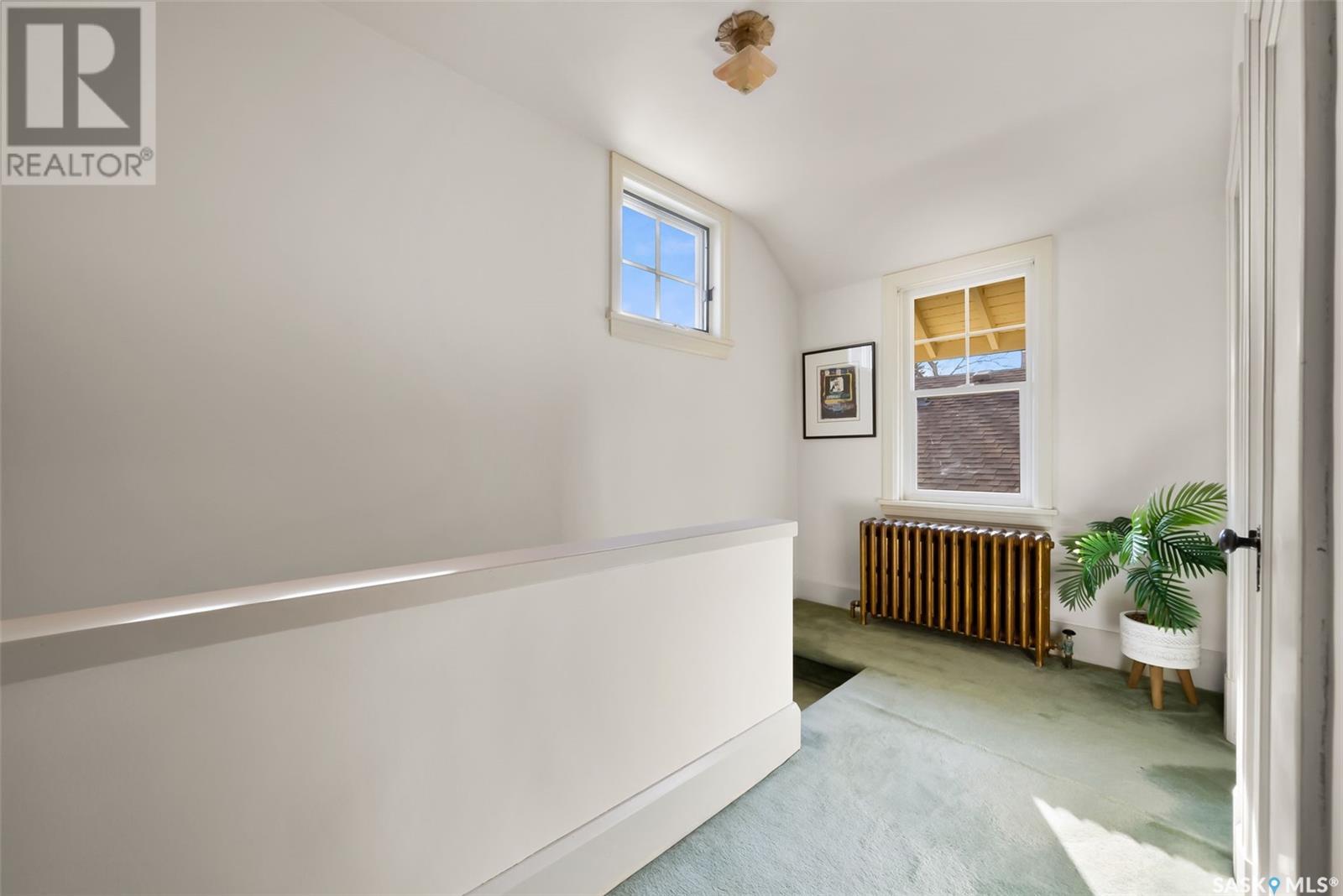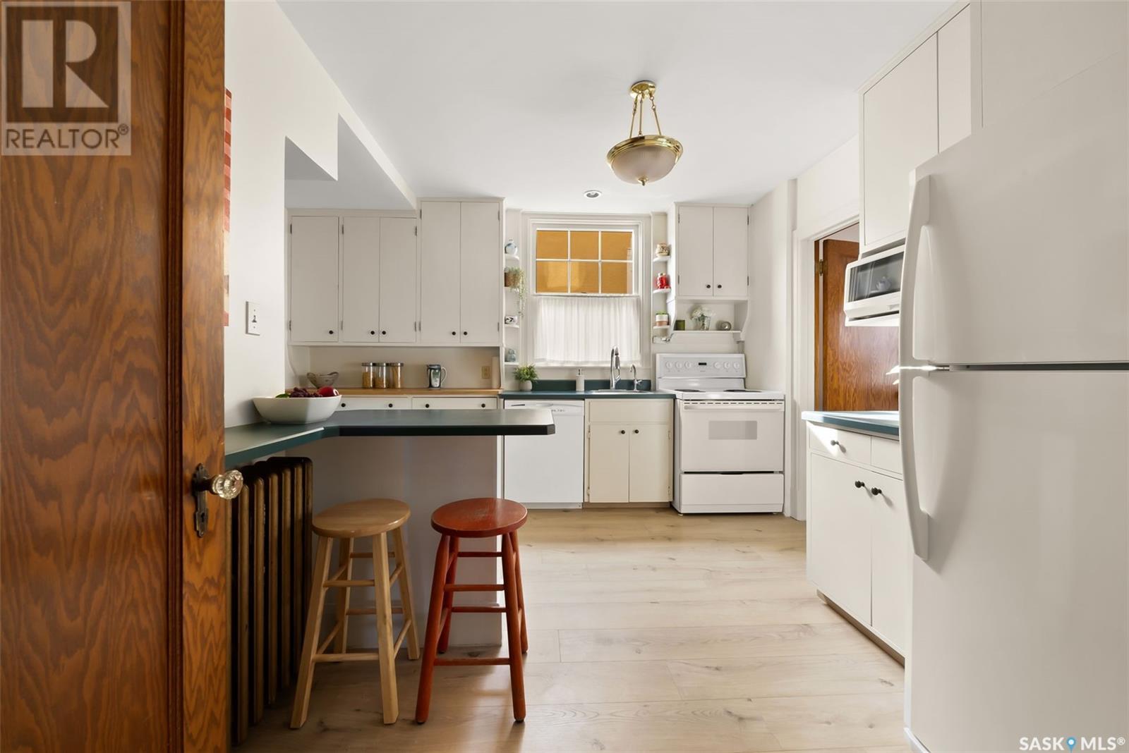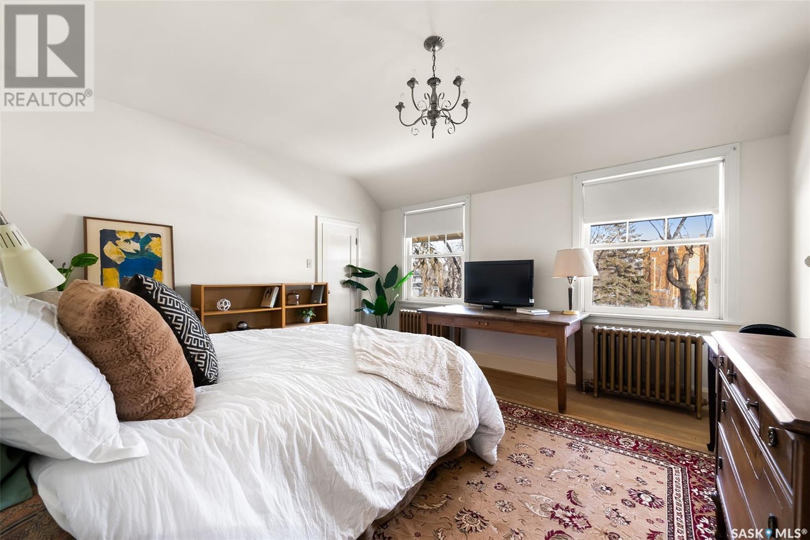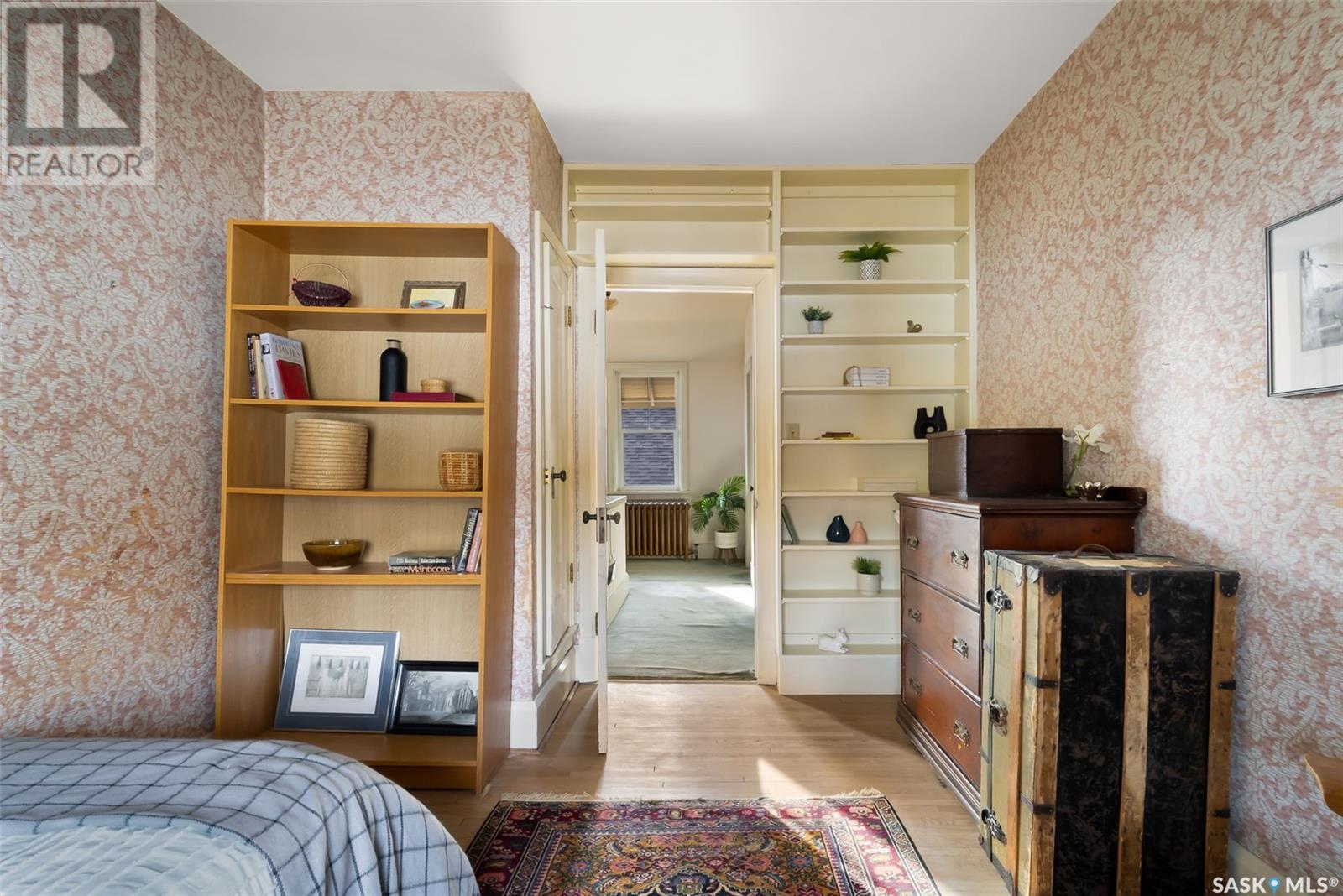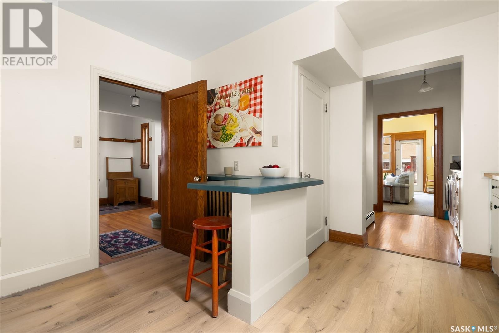 Nestled in the prestigious Crescents neighborhood, this Francis Henry Portnall-designed character home blends timeless elegance with modern convenience. Lovingly maintained and thoughtfully updated, it offers exceptional charm and functionality. A 2007 main floor addition, built on piles, enhances the space with a bright family room featuring vaulted ceilings, windows on three sides, and garden doors to a south-facing deck and backyard—ideal for relaxation and entertaining. The foyer welcomes you with original coat hooks and a large closet. French door leads to the front living room, where an original brick fireplace is flanked by built-in bookshelves with glass doors. Hardwood floors flow through the living and dining rooms, maintaining the home’s rich character. The formal dining room, perfect for entertaining, connects to a kitchen with original ceiling-height cabinetry, updated countertops, a butcher block section, a pantry, and a cozy eating nook. Newer vinyl plank flooring and modern appliances enhance style and function. A main floor three-piece bathroom adds convenience, while a laundry room off the kitchen offers extra counter space and maple cabinetry. Original staircase leads to three hardwood-floored bedrooms and an updated four-piece bathroom with a refinished tub, terrazzo flooring, and modernized plumbing. A large linen closet provides additional storage. Basement includes a rec room, utility room, and storage with an included safe. A new boiler system (2011) and updated windows improve energy efficiency. The exterior was re-stuccoed (2019), and updated eavestroughs ensure durability. The oversized single detached garage, built in 2007, provides ample parking and storage, featuring upgraded electrical and shelving. Ideally located, this home is a short walk to downtown, Wascana Park, The Crescents Elementary School, and Cathedral shops. Own a piece of Regina’s history in one of its most sought-after neighborhoods. Don’t miss this rare opportunity! (id:17834)