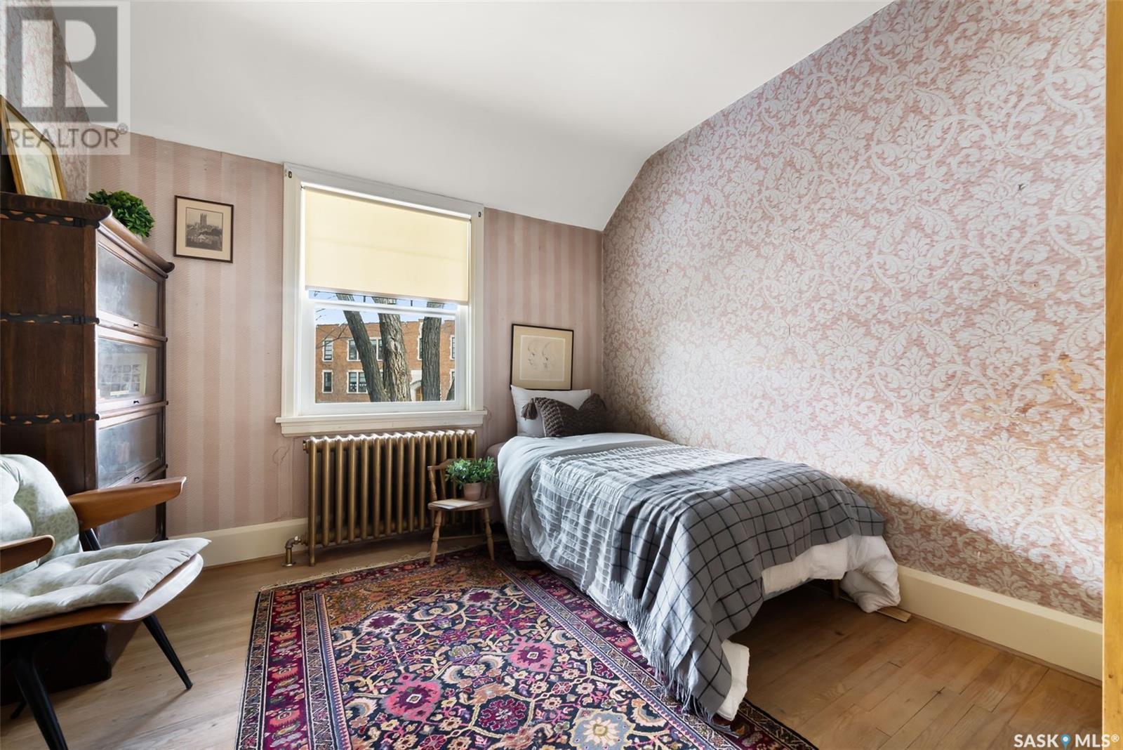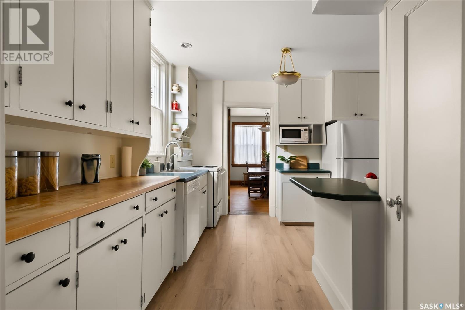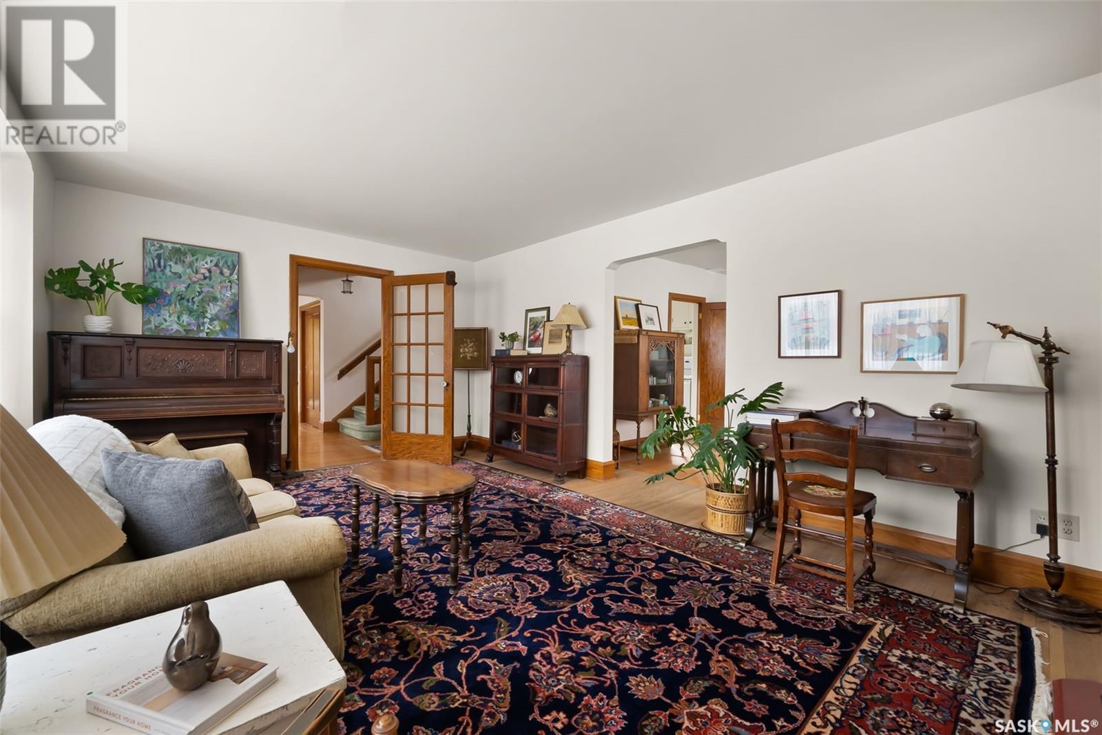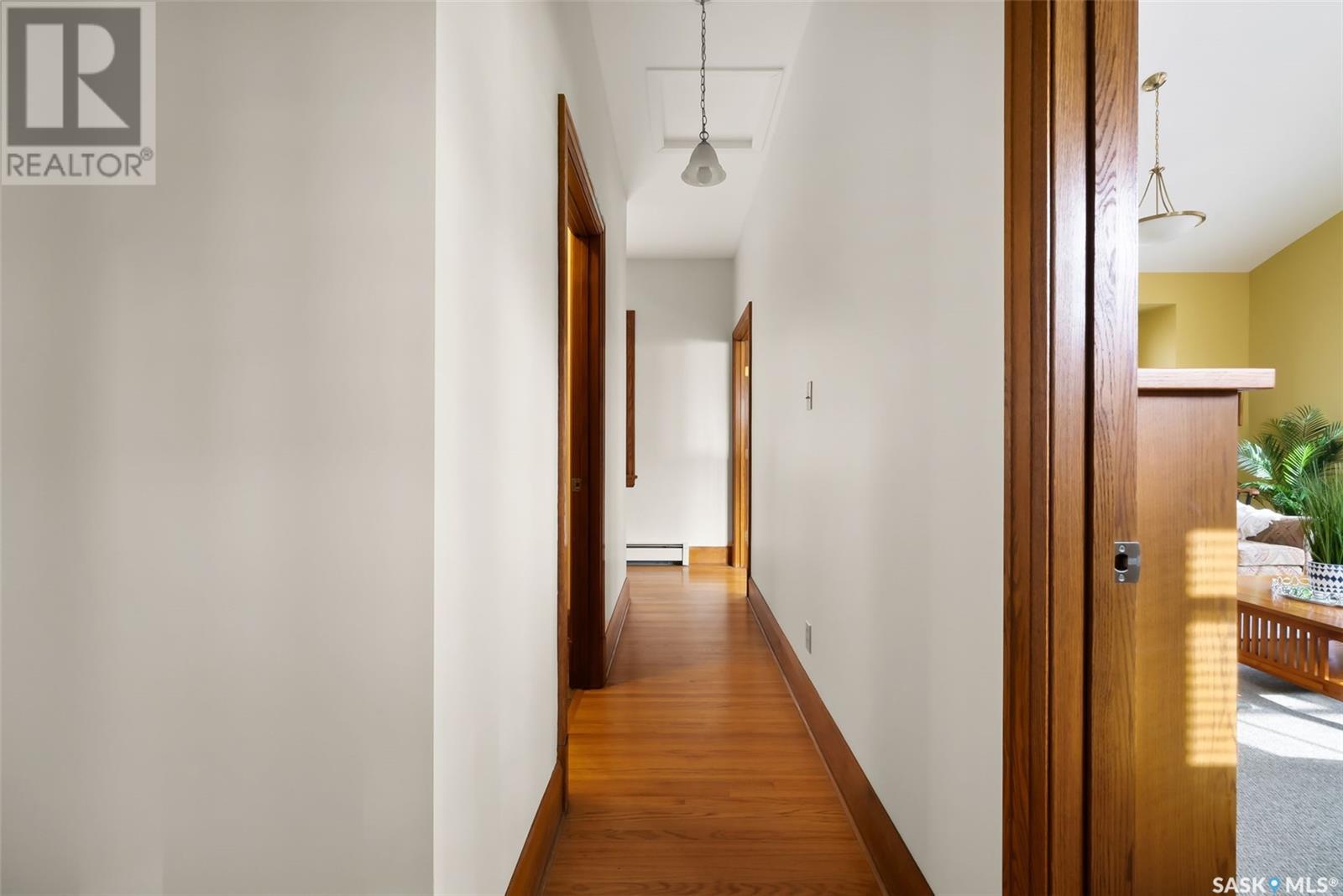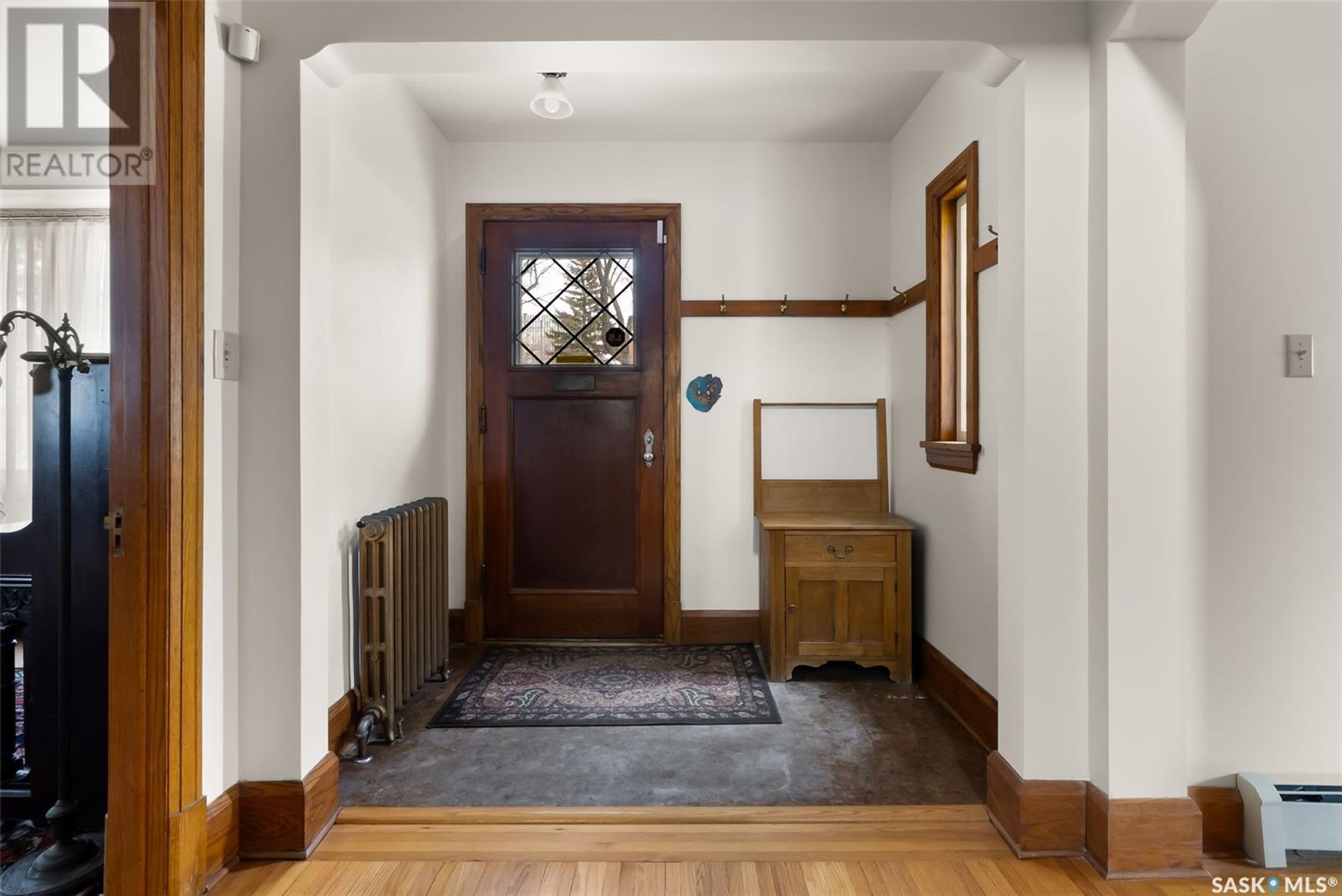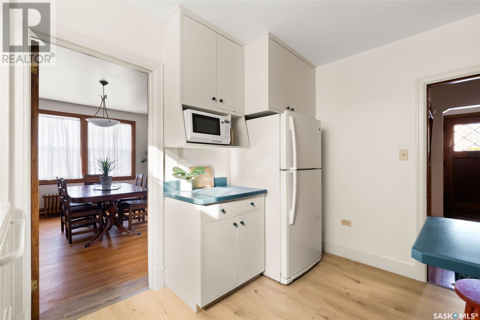Nestled in the prestigious Crescents neighborhood, this Francis Henry Portnall-designed character home blends timeless elegance with modern convenience. Lovingly maintained and thoughtfully updated, it offers exceptional charm and functionality. A 2007 main floor addition, built on piles, enhances the space with a bright family room featuring vaulted ceilings, windows on three sides, and garden doors to a south-facing deck and backyard—ideal for relaxation and entertaining. The foyer welcomes you with original coat hooks and a large closet. French door leads to the front living room, where an original brick fireplace is flanked by built-in bookshelves with glass doors. Hardwood floors flow through the living and dining rooms, maintaining the home’s rich character. The formal dining room, perfect for entertaining, connects to a kitchen with original ceiling-height cabinetry, updated countertops, a butcher block section, a pantry, and a cozy eating nook. Newer vinyl plank flooring and modern appliances enhance style and function. A main floor three-piece bathroom adds convenience, while a laundry room off the kitchen offers extra counter space and maple cabinetry. Original staircase leads to three hardwood-floored bedrooms and an updated four-piece bathroom with a refinished tub, terrazzo flooring, and modernized plumbing. A large linen closet provides additional storage. Basement includes a rec room, utility room, and storage with an included safe. A new boiler system (2011) and updated windows improve energy efficiency. The exterior was re-stuccoed (2019), and updated eavestroughs ensure durability. The oversized single detached garage, built in 2007, provides ample parking and storage, featuring upgraded electrical and shelving. Ideally located, this home is a short walk to downtown, Wascana Park, The Crescents Elementary School, and Cathedral shops. Own a piece of Regina’s history in one of its most sought-after neighborhoods. Don’t miss this rare opportunity! (id:17834)