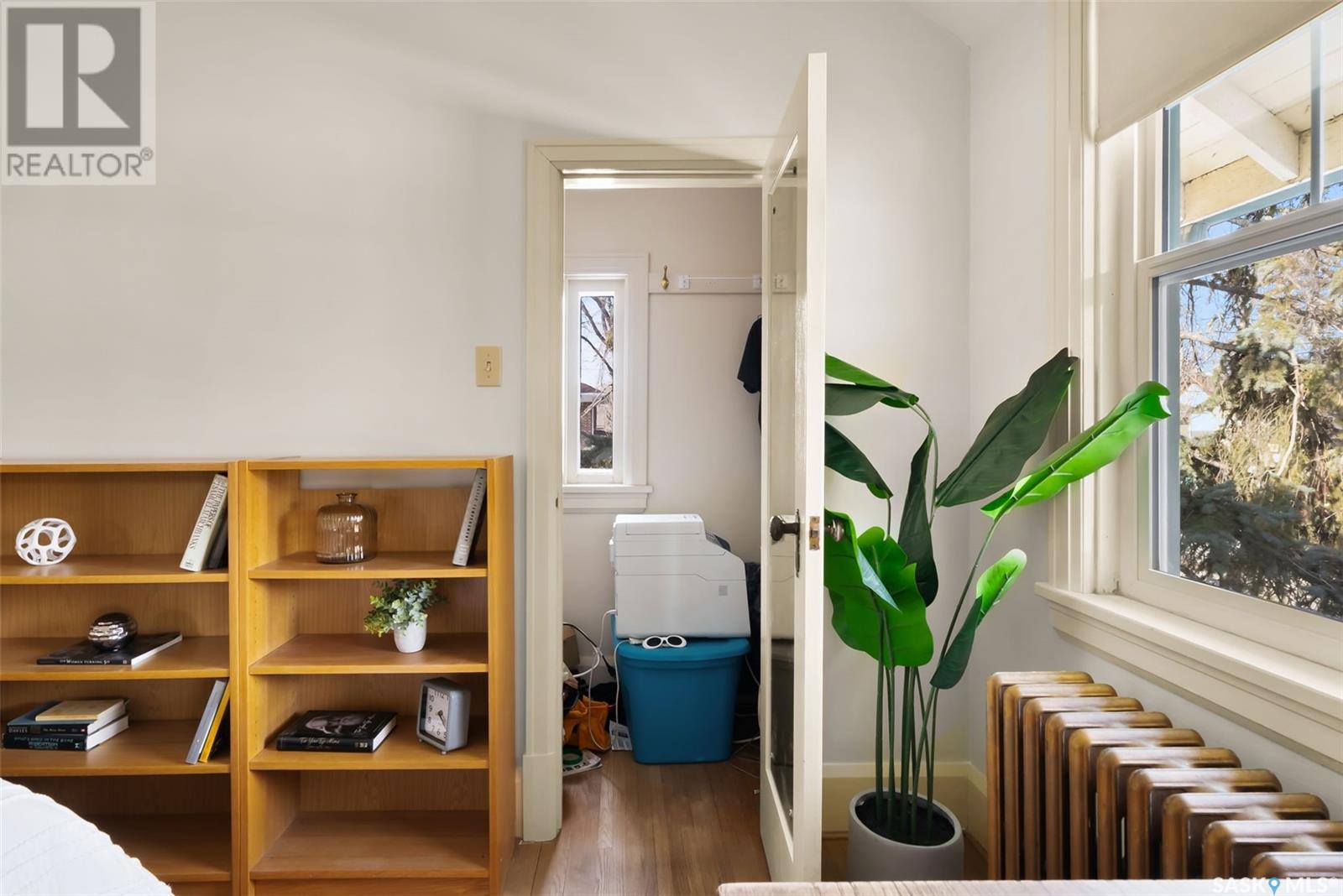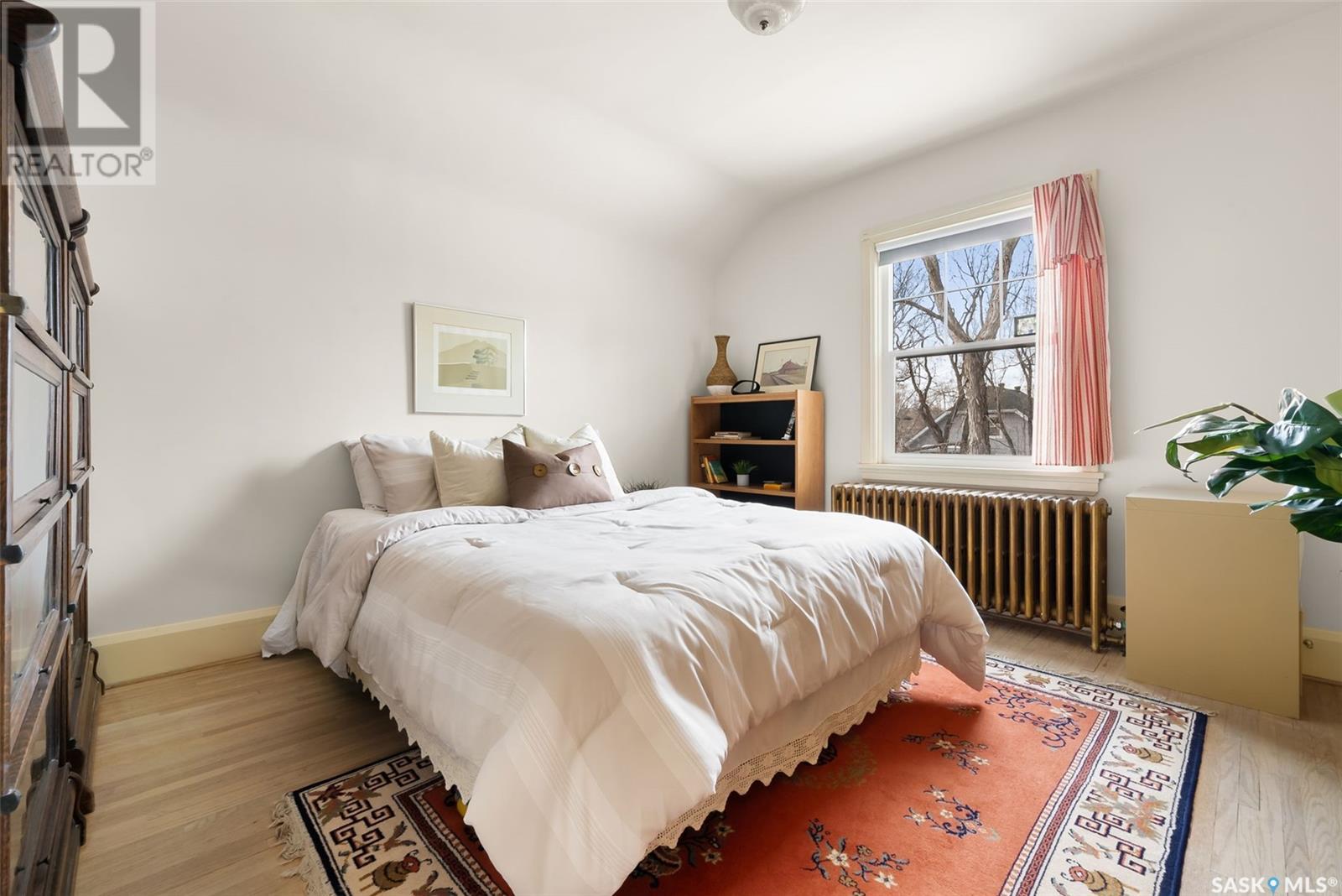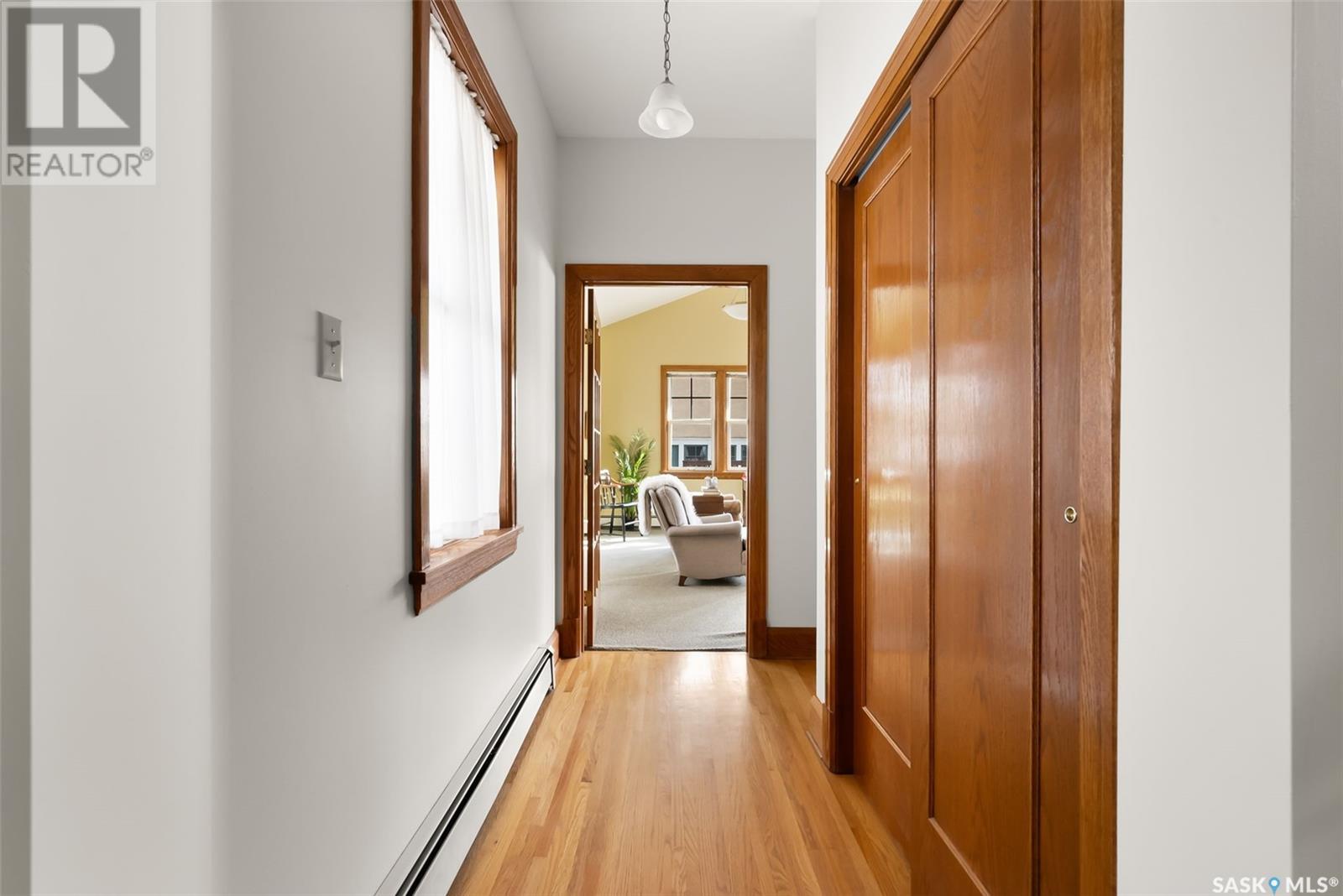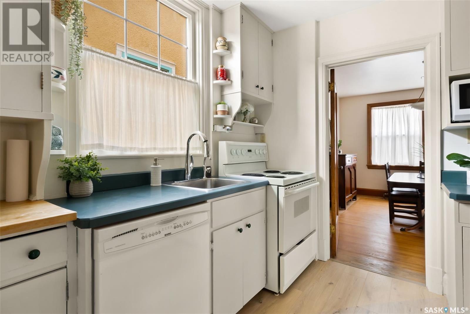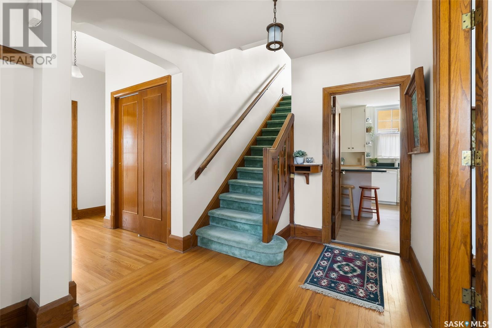 Nestled in the prestigious Crescents neighborhood, this Francis Henry Portnall-designed character home blends timeless elegance with modern convenience. Lovingly maintained and thoughtfully updated, it offers exceptional charm and functionality. A 2007 main floor addition, built on piles, enhances the space with a bright family room featuring vaulted ceilings, windows on three sides, and garden doors to a south-facing deck and backyard—ideal for relaxation and entertaining. The foyer welcomes you with original coat hooks and a large closet. French door leads to the front living room, where an original brick fireplace is flanked by built-in bookshelves with glass doors. Hardwood floors flow through the living and dining rooms, maintaining the home’s rich character. The formal dining room, perfect for entertaining, connects to a kitchen with original ceiling-height cabinetry, updated countertops, a butcher block section, a pantry, and a cozy eating nook. Newer vinyl plank flooring and modern appliances enhance style and function. A main floor three-piece bathroom adds convenience, while a laundry room off the kitchen offers extra counter space and maple cabinetry. Original staircase leads to three hardwood-floored bedrooms and an updated four-piece bathroom with a refinished tub, terrazzo flooring, and modernized plumbing. A large linen closet provides additional storage. Basement includes a rec room, utility room, and storage with an included safe. A new boiler system (2011) and updated windows improve energy efficiency. The exterior was re-stuccoed (2019), and updated eavestroughs ensure durability. The oversized single detached garage, built in 2007, provides ample parking and storage, featuring upgraded electrical and shelving. Ideally located, this home is a short walk to downtown, Wascana Park, The Crescents Elementary School, and Cathedral shops. Own a piece of Regina’s history in one of its most sought-after neighborhoods. Don’t miss this rare opportunity! (id:17834)