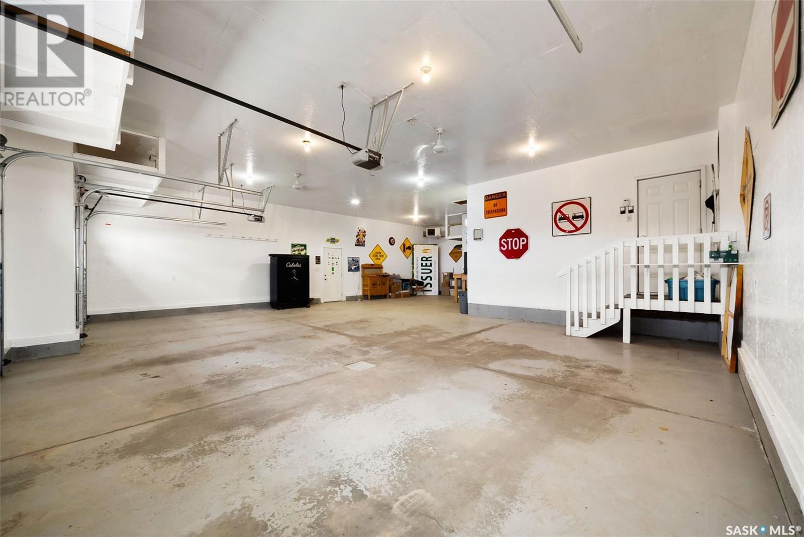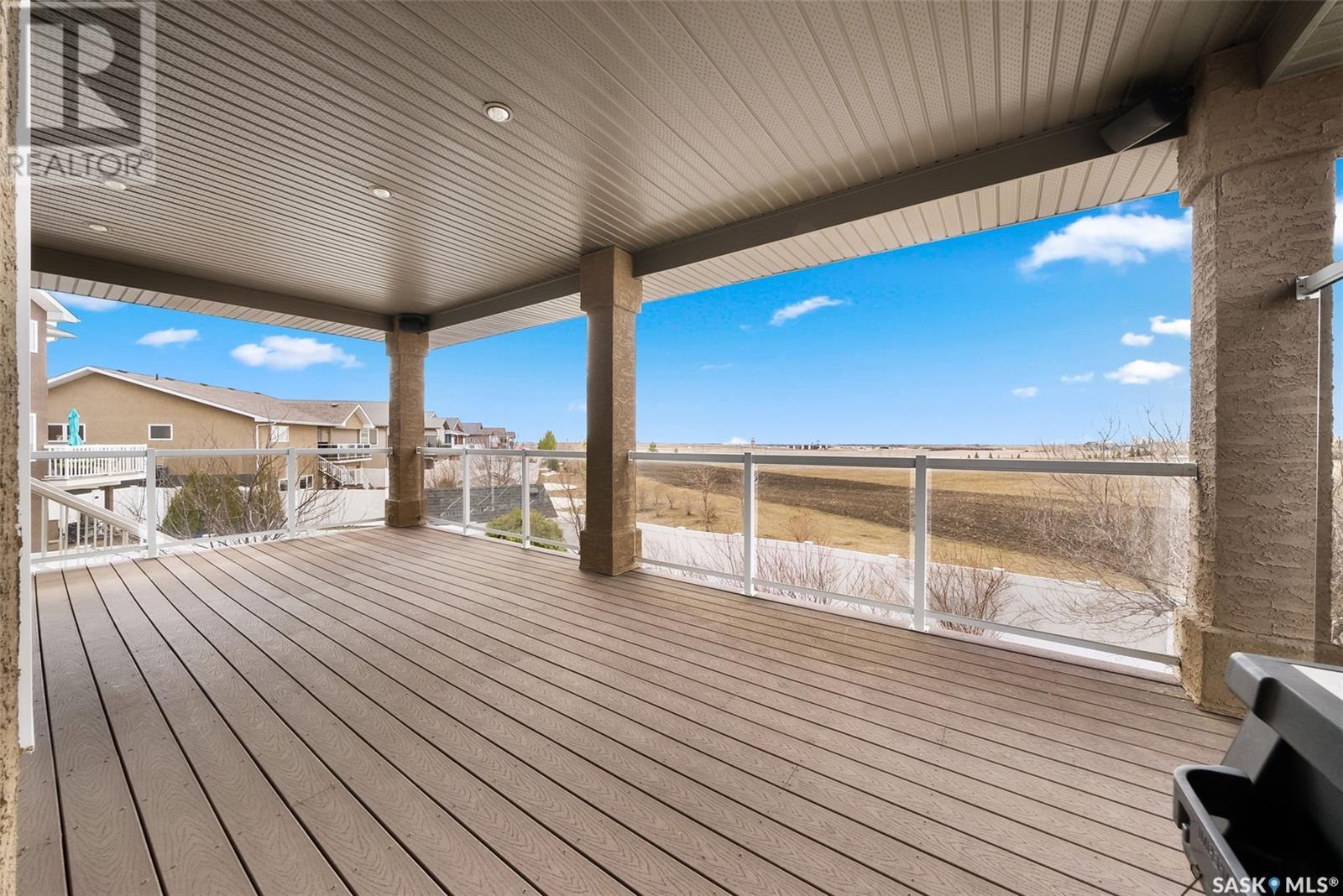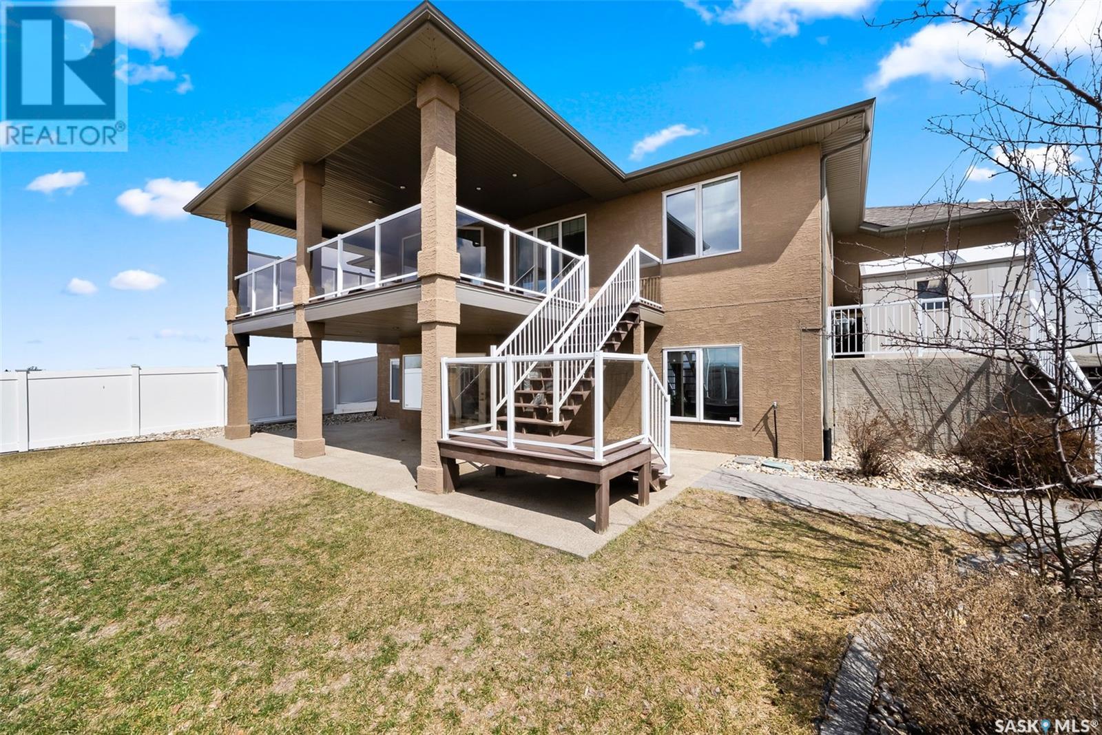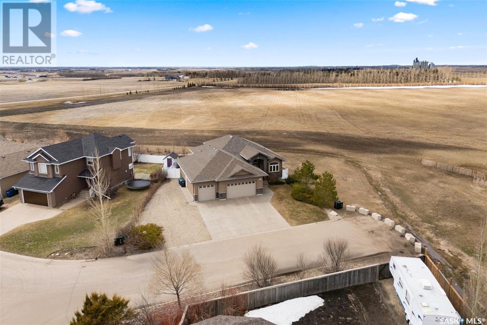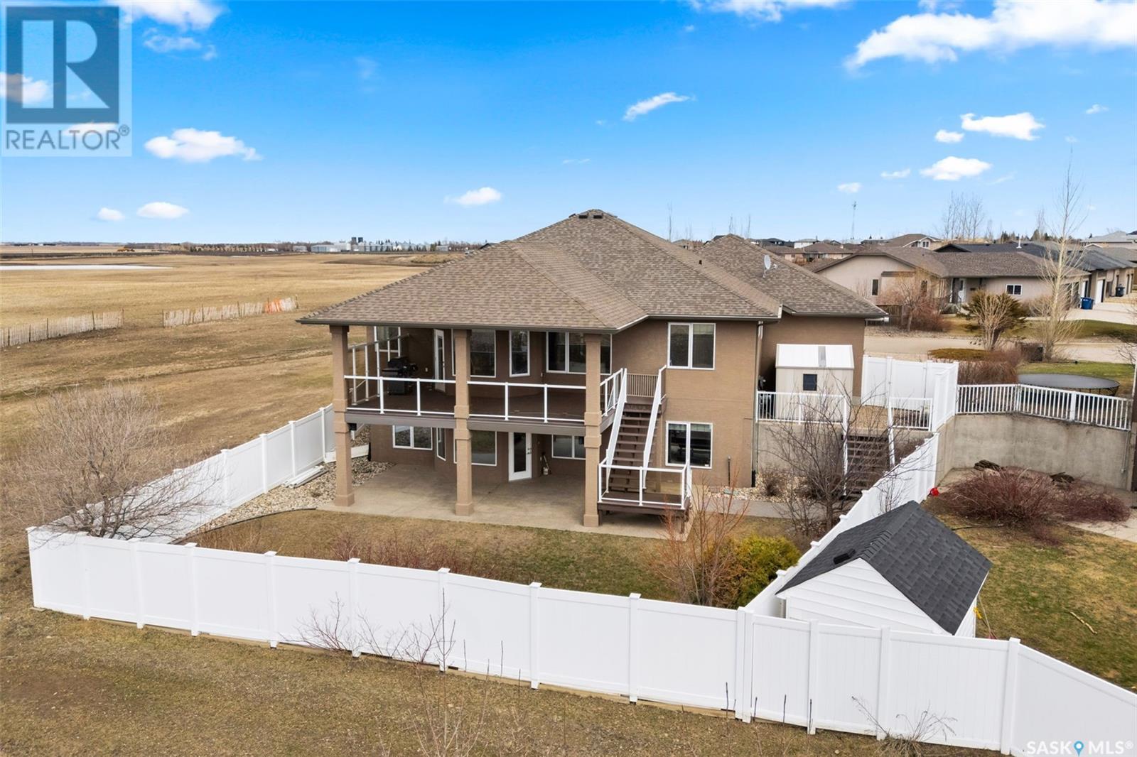 Rare Walkout Bungalow in Balgonie — Spacious, Upgraded, and Just 15 Minutes from Regina! Welcome to this immaculate 1771 sq ft walkout bungalow on a massive 9147 sq ft corner lot. With 4 bedrooms, 3 bathrooms, and a smart, upgraded layout, this home offers comfort, privacy, and style—situated at the end of a quiet street with only one neighbor. Step into a spacious foyer with a walk-in closet and open glass rail staircase. A front office doubles as a bedroom, while a second bedroom and full bath are tucked off to one side. The private primary suite features a luxurious 5-piece ensuite, walk-in closet, and direct access to the soundproofed laundry room. The heart of the home is the open-concept kitchen, living, and dining area, with granite counters, hardwood floors, built-in speakers, and prairie views. The dining room opens to a covered deck—perfect for relaxing or entertaining. Downstairs, the bright walkout basement includes a large open area ideal for a home theatre or games room (wet bar rough-in in place), a 3-piece bath, fourth bedroom, and utility room. The fully fenced yard includes a patio wired for a hot tub, mature landscaping, underground sprinklers, RV parking, and an 8×10 shed. A true highlight is the 4-car dream garage—over 1000 sq ft of heated space with 11’ ceilings, 8’ doors, fresh paint, shelving, and tandem parking up to 41’ long. Built on piles, this home also offers triple-zone heating, triple-pane windows, a new 2023 roof, custom blinds, central air, a water softener, and so much more. Don’t miss this rare opportunity to enjoy space, quality, and peaceful living just outside the city. (id:17834)