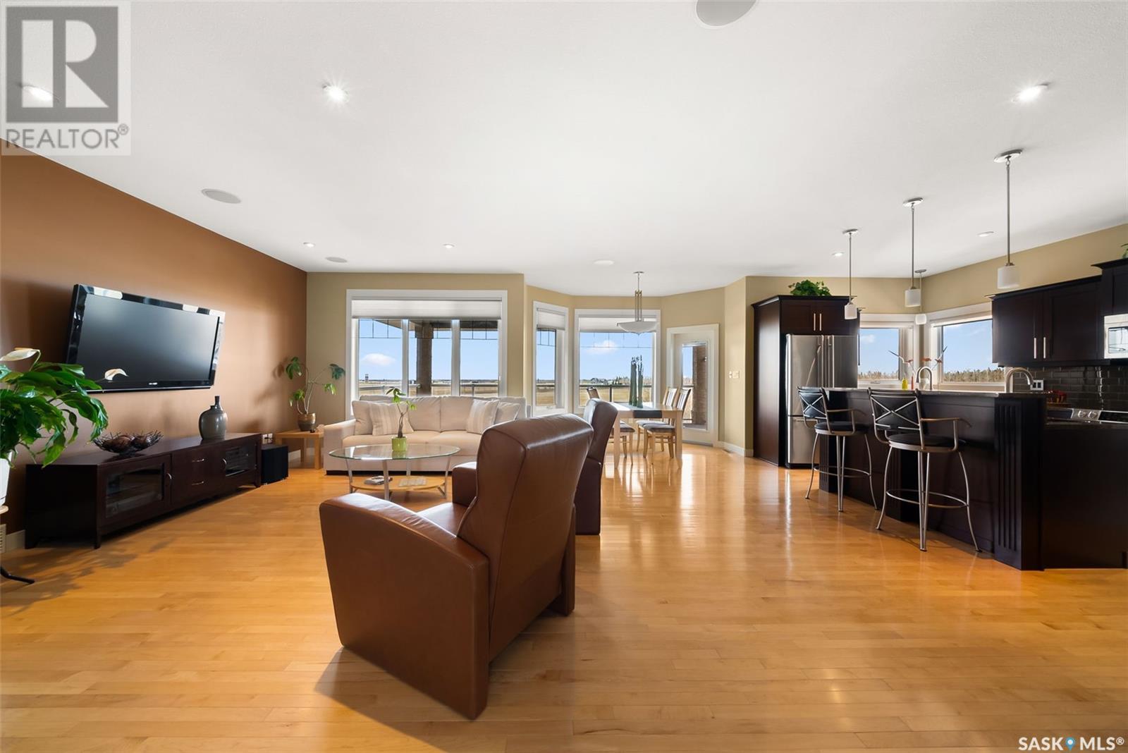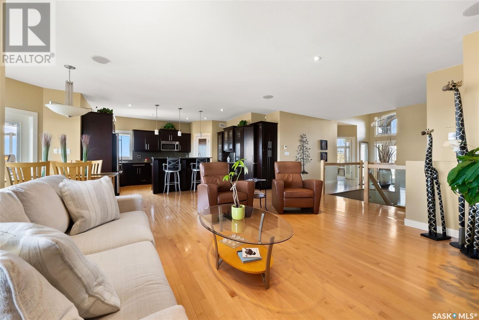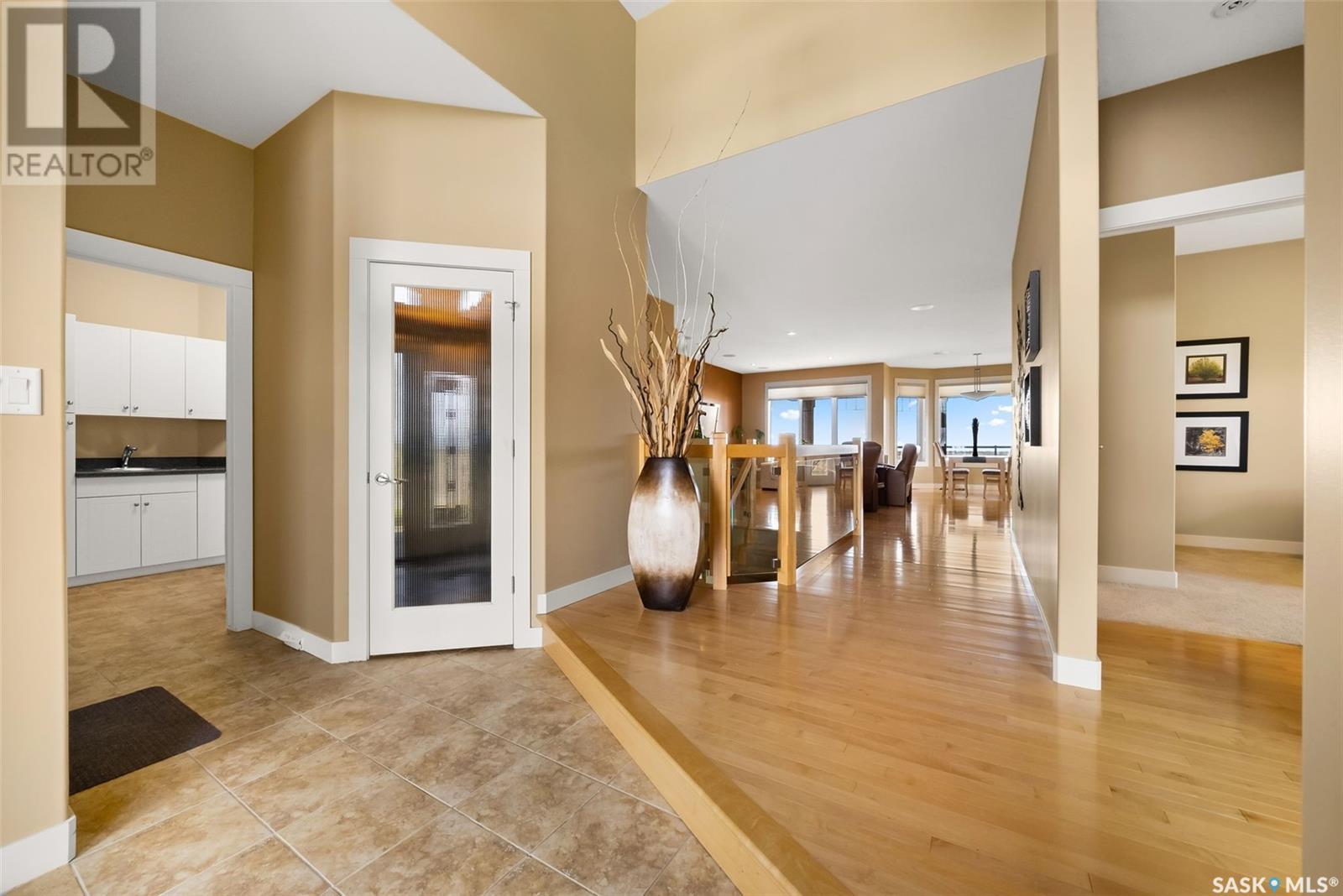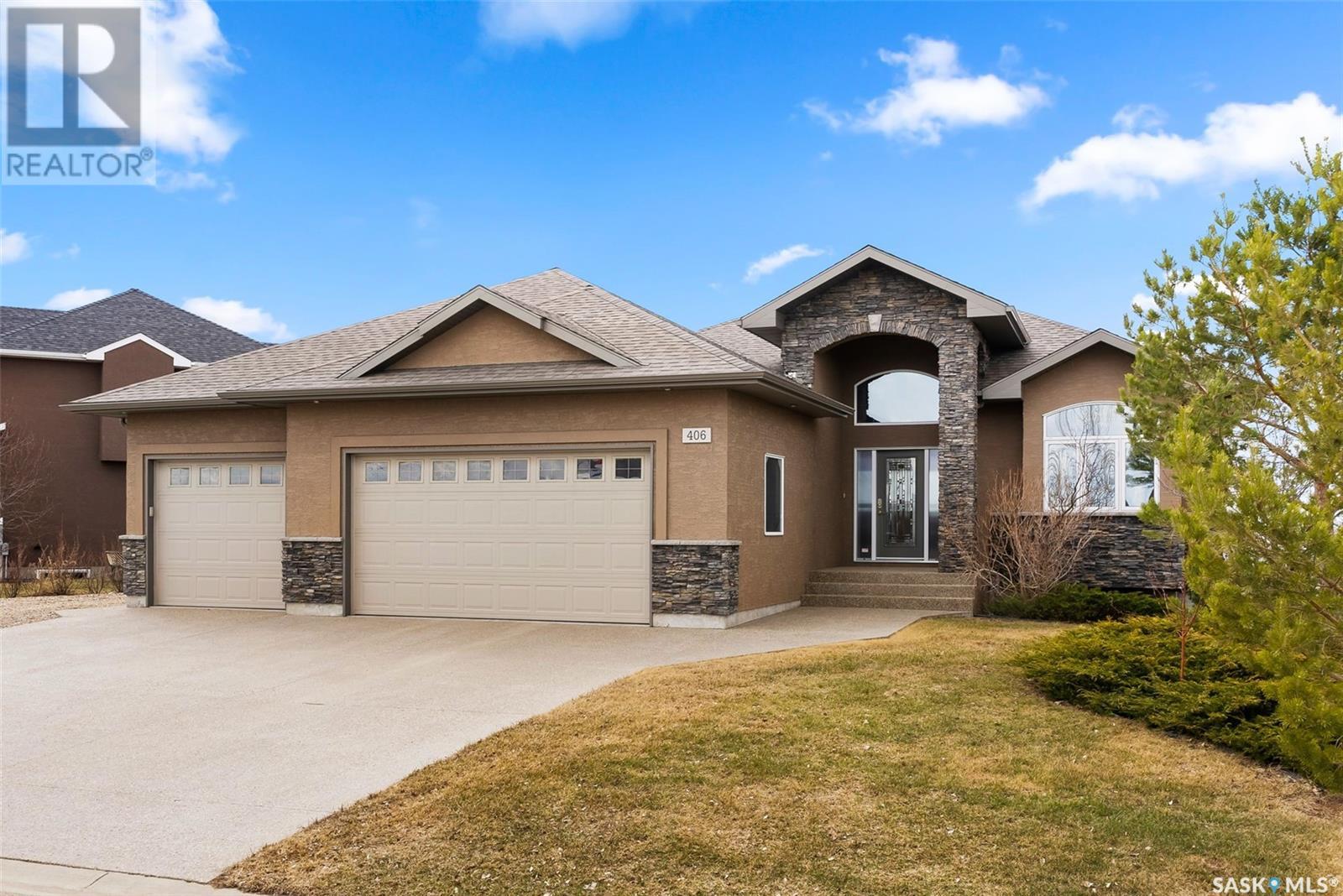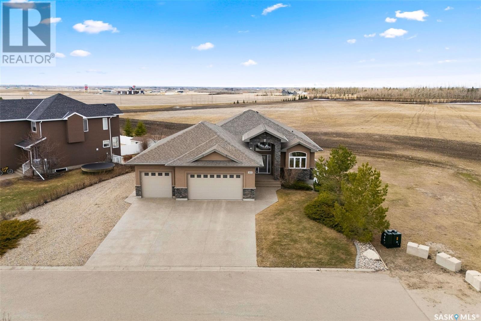 Rare Walkout Bungalow in Balgonie — Spacious, Upgraded, and Just 15 Minutes from Regina! Welcome to this immaculate 1771 sq ft walkout bungalow on a massive 9147 sq ft corner lot. With 4 bedrooms, 3 bathrooms, and a smart, upgraded layout, this home offers comfort, privacy, and style—situated at the end of a quiet street with only one neighbor. Step into a spacious foyer with a walk-in closet and open glass rail staircase. A front office doubles as a bedroom, while a second bedroom and full bath are tucked off to one side. The private primary suite features a luxurious 5-piece ensuite, walk-in closet, and direct access to the soundproofed laundry room. The heart of the home is the open-concept kitchen, living, and dining area, with granite counters, hardwood floors, built-in speakers, and prairie views. The dining room opens to a covered deck—perfect for relaxing or entertaining. Downstairs, the bright walkout basement includes a large open area ideal for a home theatre or games room (wet bar rough-in in place), a 3-piece bath, fourth bedroom, and utility room. The fully fenced yard includes a patio wired for a hot tub, mature landscaping, underground sprinklers, RV parking, and an 8×10 shed. A true highlight is the 4-car dream garage—over 1000 sq ft of heated space with 11’ ceilings, 8’ doors, fresh paint, shelving, and tandem parking up to 41’ long. Built on piles, this home also offers triple-zone heating, triple-pane windows, a new 2023 roof, custom blinds, central air, a water softener, and so much more. Don’t miss this rare opportunity to enjoy space, quality, and peaceful living just outside the city. (id:17834)