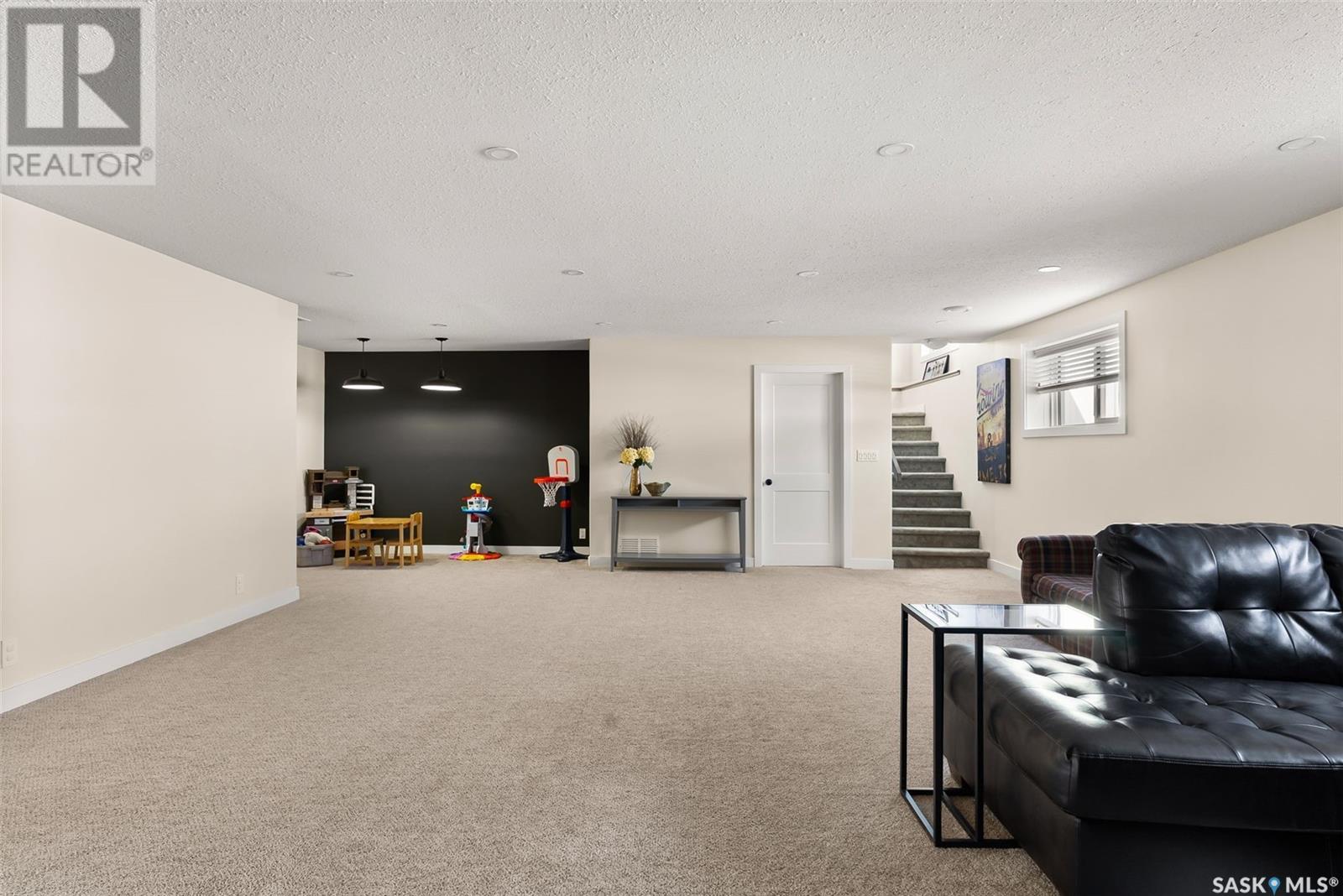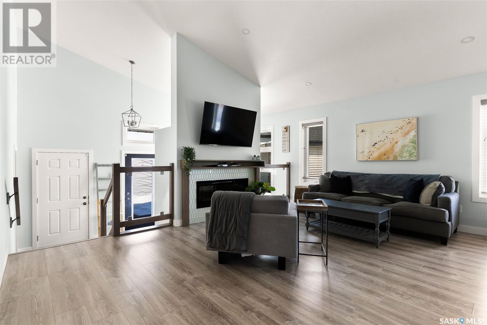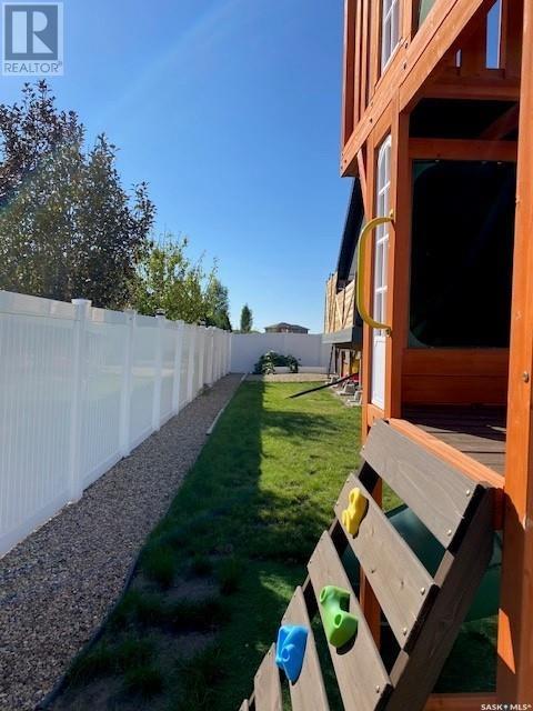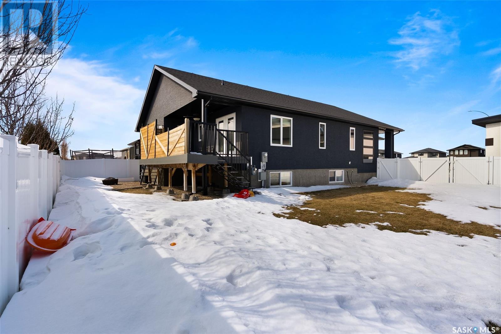 Welcome to this stunning 1,584 sq. ft. custom-built Gilroy bungalow in Regina’s desirable Maple Ridge. Situated on a spacious pie-shaped, fully fenced lot, this 5-bedroom, 3-bathroom home is just a short walk from St. Angela Elementary School, parks, pathways, and a spray pad—ideal for families. Step inside to a bright, spacious entryway with ample storage and direct access to the heated, insulated 24’ x 26’ double attached garage. Designed for convenience, the garage features transom windows for natural light and a 220V plug—perfect for a workshop or EV charging. The open-concept main living area is warm and inviting, featuring a stylish tile-surround fireplace. Four additional east-facing windows bring in beautiful natural light. The kitchen showcases custom “winter maple” cabinetry, a centre island, a corner pantry, a gas range, and a sleek glass tile backsplash. Custom Roman shades add a refined touch to the kitchen and dining area. The primary suite offers a walk-in closet and a 4-piece ensuite. Two more bedrooms and a full bath complete the main level, providing space for a growing family. Downstairs, the professionally finished basement expands your living space with a large rec room—ideal for entertaining or family movie nights. A feature wallpaper wall adds style, and rough-in plumbing is ready for a future bar area. Two additional bedrooms and a 3-piece bath make this level perfect for guests, teens, or a home office. Both basement bedrooms have new carpet for extra comfort. Step outside to the large, fully fenced backyard with plenty of room for outdoor enjoyment. A play structure makes this space kid-friendly, while the gas BBQ hookup ensures effortless summer grilling. A private fire pit area offers a cozy retreat for relaxing evenings. The spacious deck is perfect for entertaining. With its prime location, thoughtful design, and generous living space, this home is a must-see. Don’t miss out—contact your REALTOR® today to make it yours! (id:17834)